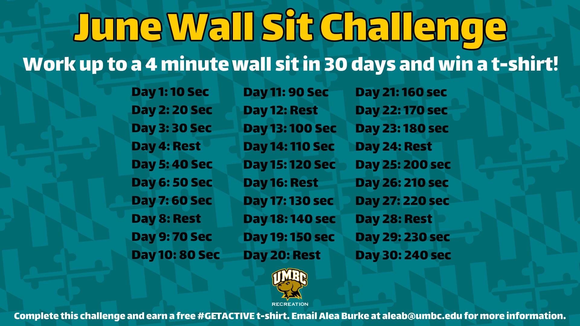 Strengthen your core & legs by working your way up to a 4 minute wall sit by following the attached calendar! Earn a free #getactive t-shirt upon completion.