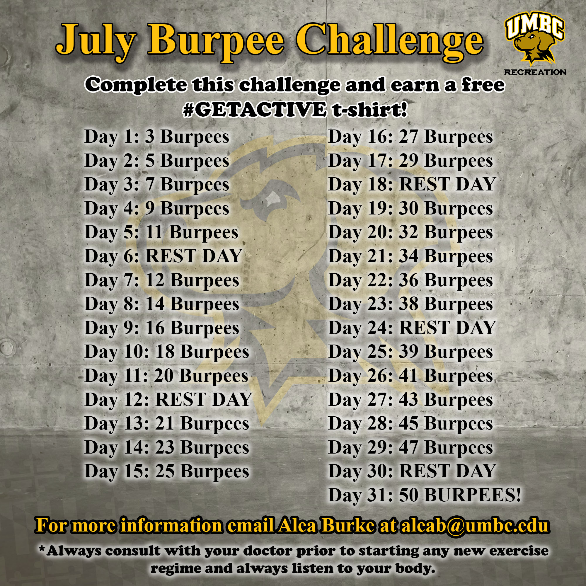 All fitness levels can participate! Check out our UMBC REC website to learn more about how to do a burpees and ways to modify.