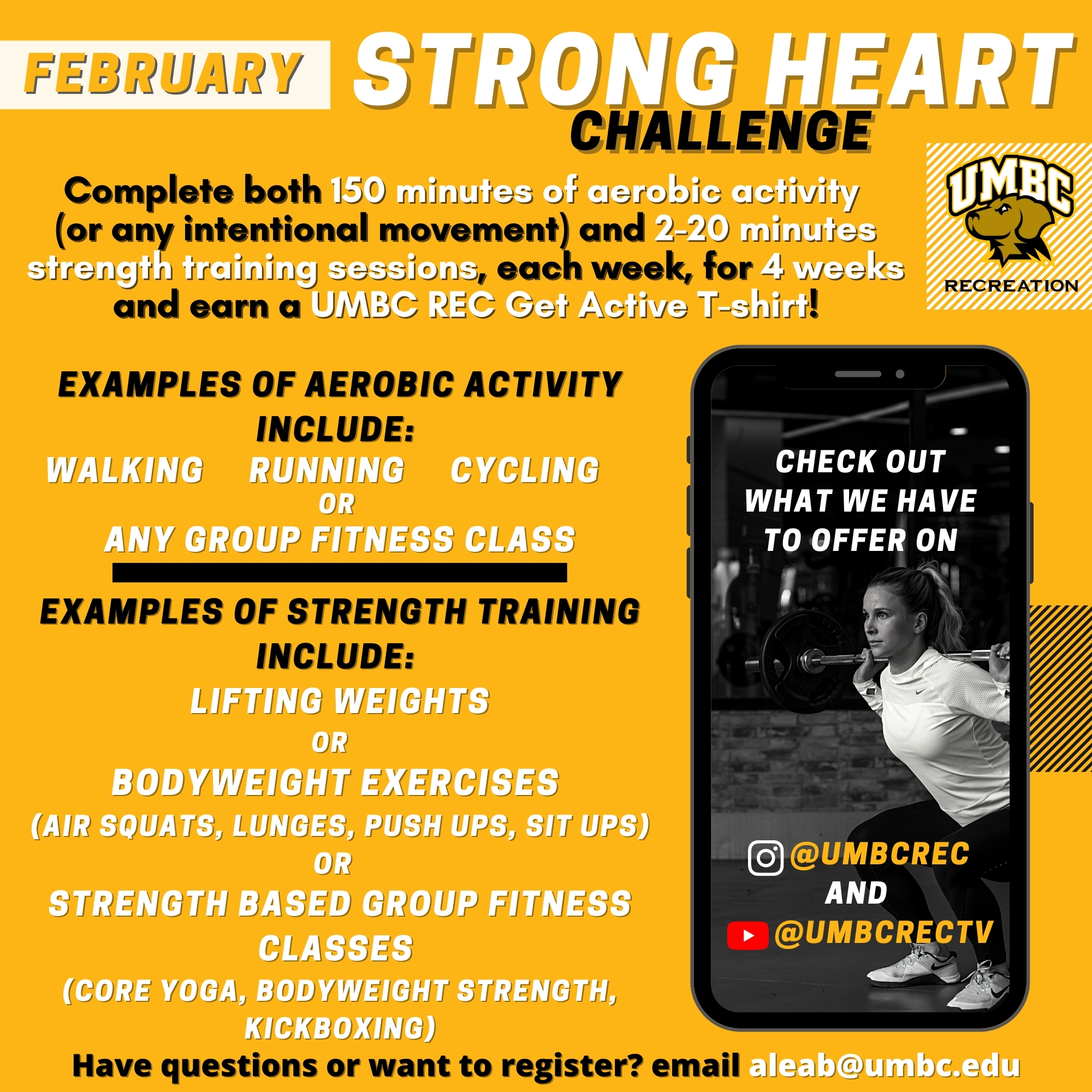 In the month of February, complete both 150 minutes of cardiovascular exercise (or intentional movement) and 2-20 minute strength training sessions each week, for four weeks and earn a free UMBC T!
